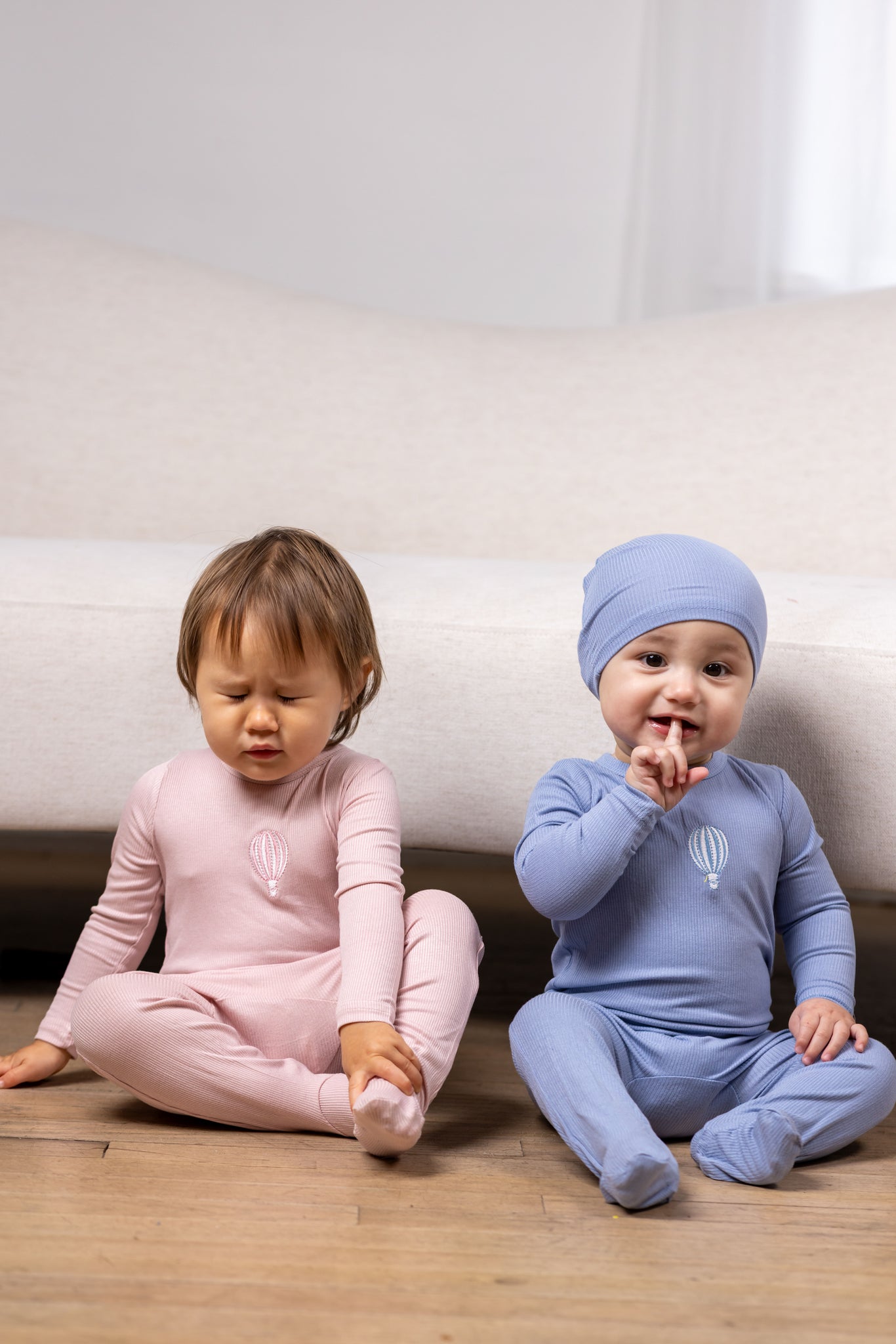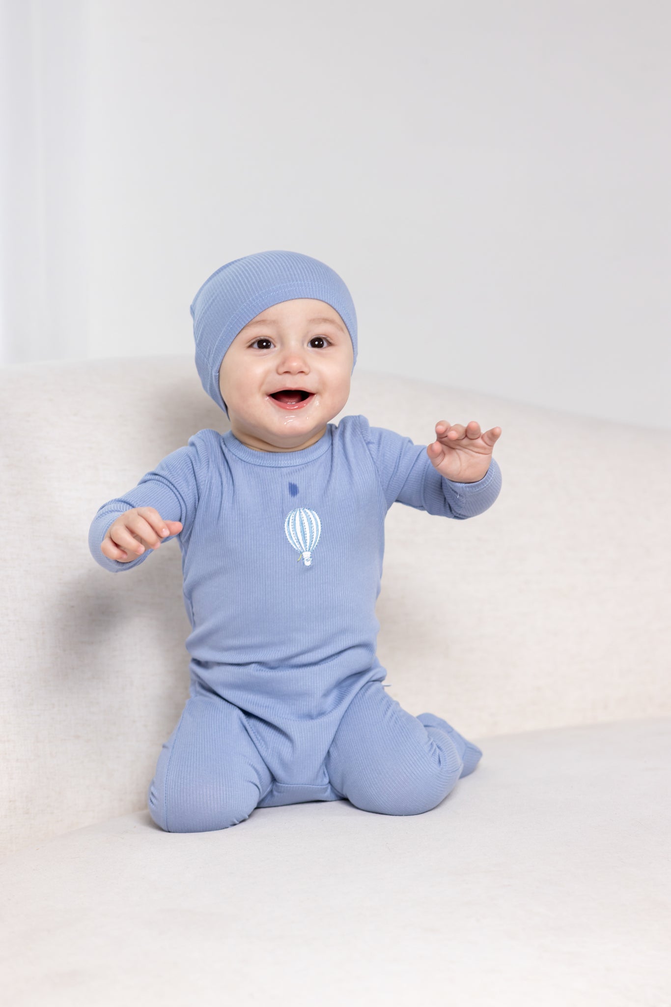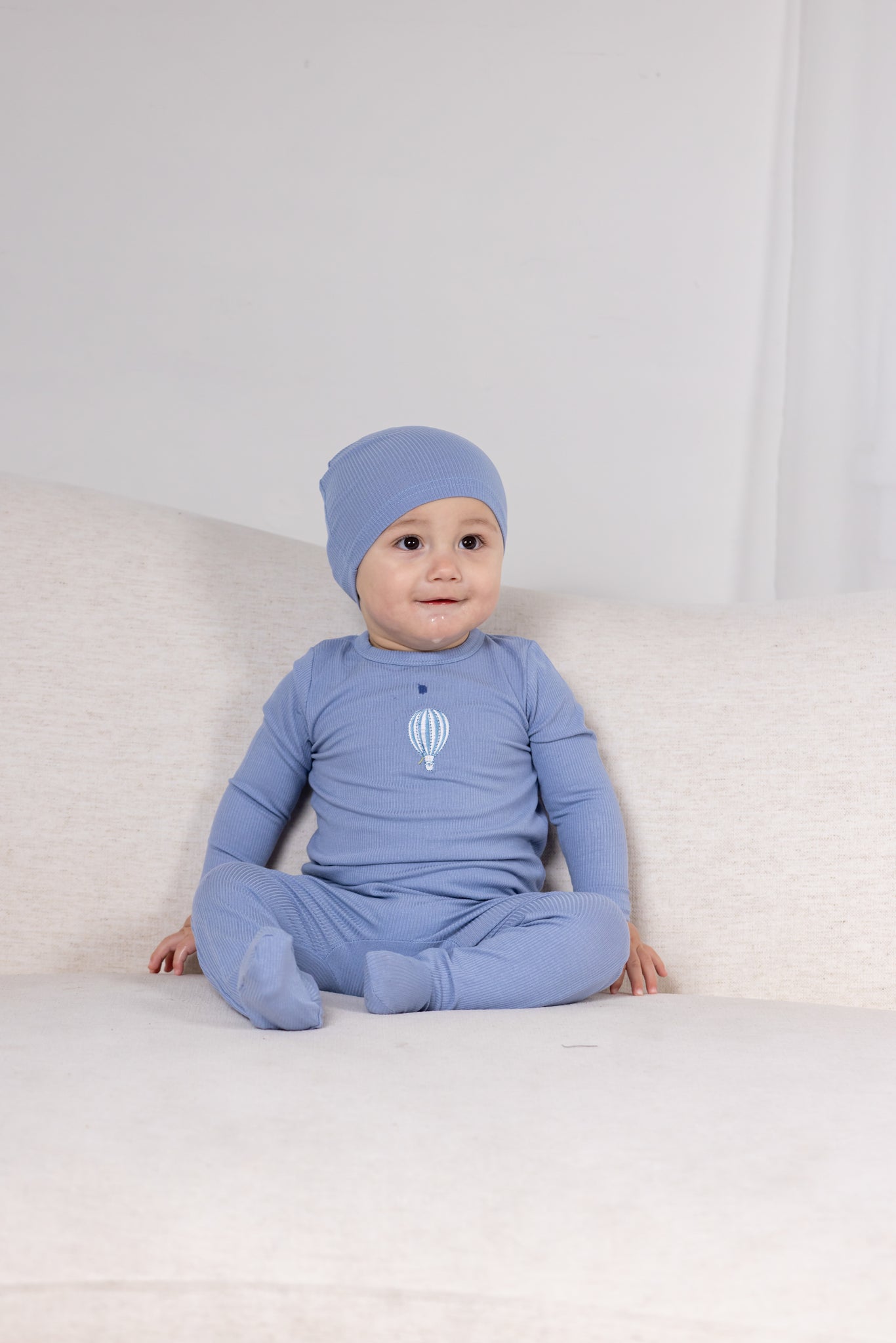 Soar into style with this charming hot air balloon footie in blue! Featuring a delicate embroidered graphic that captures the magic of adventure, this piece combines classy sophistication with playful whimsy. The ribbed fabric provides gentle support while the excellent stretch ensures a great fit that grows with your little explorer. Soft, durable, and wonderfully wearable for all their dreamy days ahead.
